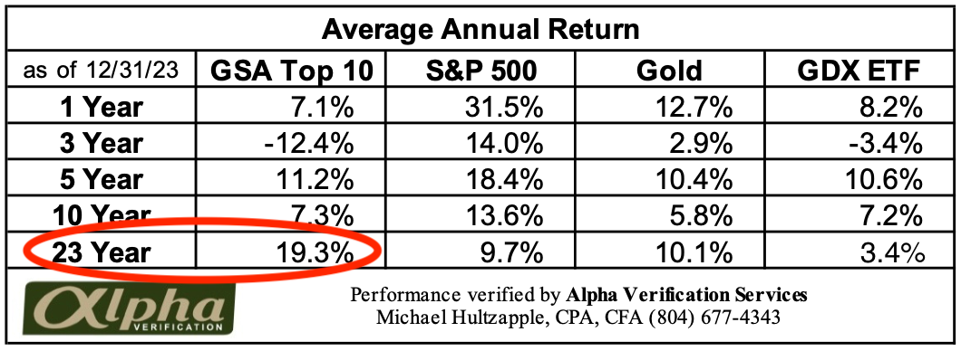 John's GSA Top10 gold stocks gained an independently audited average of 19.3% over 23 years. But John had an idea. He looked harder at the numbers and calculated each year's return for the 5 best stocks in the GSA Top 10. The results were an amazing 47.8% average gain, more than double the gain for 10 stocks. Five stocks can be riskier than 10. So John figured out how to de-risk his picks even further. You can read more about that here (PDF).